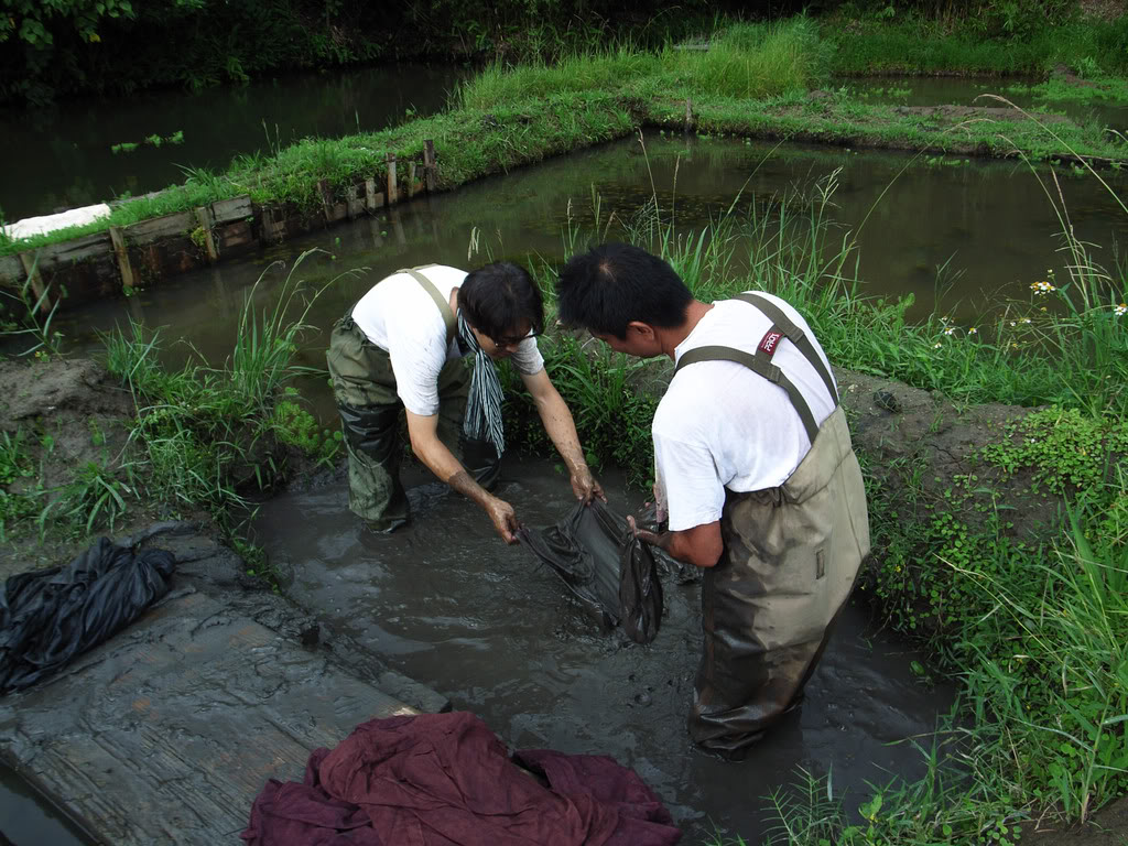 These jeans are hand dyed in indigo vats and mud ditches by artisans who still practice the technique of mud dying. Mud dyeing was used for achieving black before it was replaced by sulfur dye, and this technique is still practiced in Japan. Although there have been some minor changes, the technique basically remains the same. Here is what an artisan has to say about the technique…